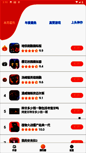 进入游戏平台后,首页会展示各类游戏推荐,有经营类、战斗类、跑酷类等。底栏设有最新火热游戏排行榜,榜单包含本周最热、年度最热以及上头神作等,玩家可自由选择。选择游戏后,玩家可以进行下载或收藏操作。