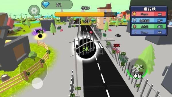 1、玩家借助虚拟摇杆操控黑洞在城市中移动,黑洞持续吞噬范围内物品,不同物品增加黑洞体积。