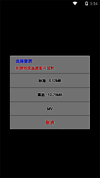 2、点击对应歌曲,会出现音质选择窗,长按可在线试听;