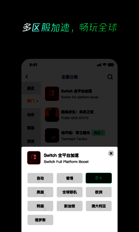 4、海量游戏覆盖:支持数千款国内外热门游戏加速,像《王者荣耀》《英雄联盟》《绝地求生》等,满足玩家多样化的游戏需求。