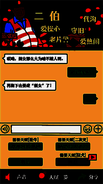 16、躺平王:二伯剧情,剧本“质疑单身”,携带狂犬天赋,怼哭二伯解锁。