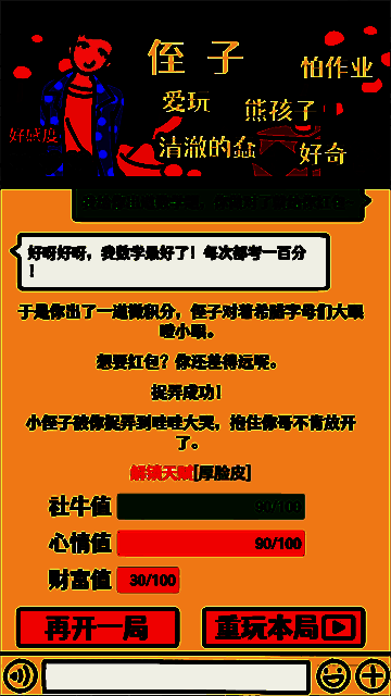 6、家徒四壁:剧本结束财富为0解锁。建议携带躺平王天赋,选择“认识我吗”剧本,第二个选择询问成绩,侄子考试第一发红包后副本结束财富归零解锁。