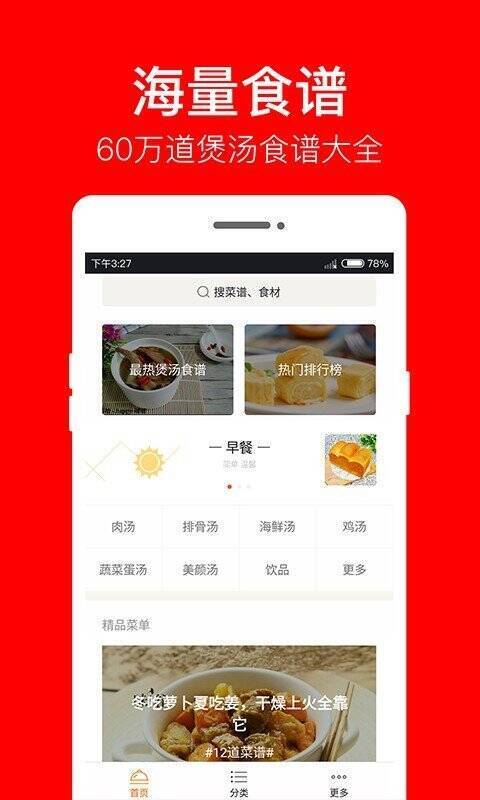 煲汤食谱是一款备受欢迎的免费美食教学软件。它有着丰富多元的美食食谱供用户查看,提供详细的食谱分类,涵盖家常菜、西餐、蛋糕等,方便用户自由挑选,能让用户轻松在线学习,随时提升厨艺,带来全方位学习体验。其美食内容皆以视频呈现,教学极为详细,助用户掌握烹饪技巧,还能让用户收藏心仪美食学习制作。
