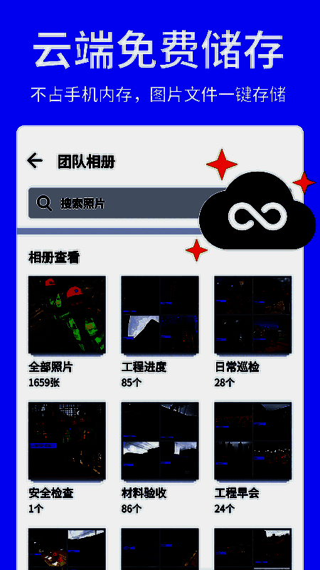 4. 拍摄工作照片同步工作圈,用电子围栏划定工作范围,离圈有警告,照片自动同步存储在团队空间,便于检查抽查。