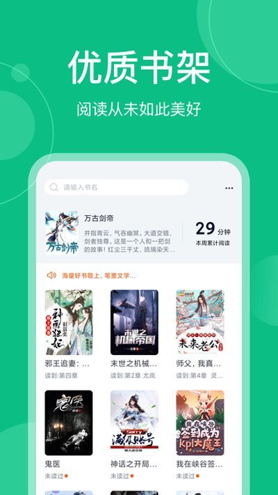 - 提供丰富阅读设置,如字体、背景、翻页等。
