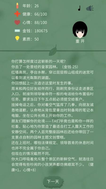 《裸辞人生模拟器官方正版》的一大显著亮点是其自由选择性。游戏没有固定的剧情走向,玩家可依据自身的决定和行动,塑造独一无二的人生轨迹。从辞职后的第一天起,游戏就给予玩家无限可能:可以选择找新工作,也能追求兴趣爱好,或是成为自由职业者、开办小生意等。每个选择都会影响人生进程,甚至改变未来。