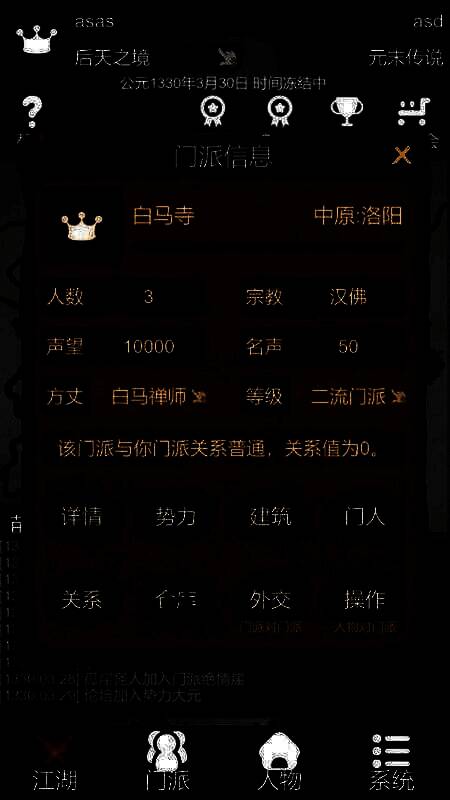 4、通过战斗、经营和任务等方式,玩家将逐步提升自身势力的影响力,最终成为江湖中的一方霸主。