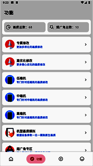 3、第二个功能板块中有5个功能,包含专属修改、机型画质模拟、机型修改、高优化修改、随机修改等选项。