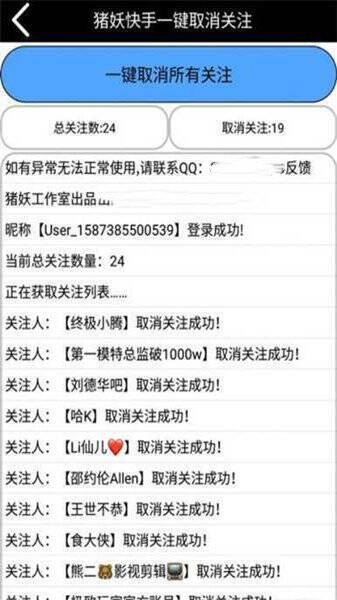 猪妖一键取关 APP 专为快手用户量身打造,能为用户提供便捷的一键取关操作。有了这款软件,用户无需逐个取消关注和点赞,选择批量操作就能简单高效地完成取关,且无任何门槛限制,功能免费使用,界面干净简洁。用户登录快手账号即可完成一系列操作,既可以一键清除全部关注,也能选择批处理、过滤、清除等方式。
