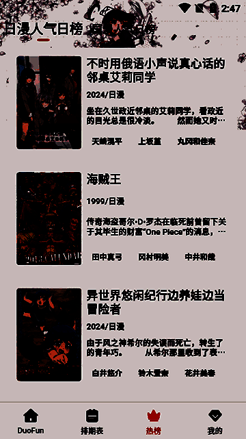 DuoFun动漫是一款专为手机打造的动漫追番软件,它为用户精心准备了丰富多样的国漫、日漫、欧美动漫资源,还对这些资源进行了细致分类,如热血、校园、纯爱、恐怖、冒险、运动等。用户可以精准定位到自己喜爱的动漫作品,轻松打发闲暇时光。此外,该软件支持离线下载动漫资源,一键缓存到本地,解决了无网络的困扰。它还能依据用户的观看历史和偏好,智能推荐符合口味的动漫。
