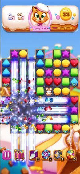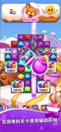 3、多样的道具加持:游戏内有炸弹、彩虹糖等多种特殊道具,助玩家更轻松完成消除任务。