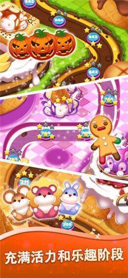 1、趣味三消玩法:玩家滑动屏幕,把相同的曲奇或糖果连成三个及以上,就能完成消除,达成关卡目标。