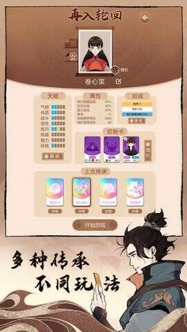 1、第一局随意玩,熟悉词条,若死亡则直接开启第二局,选取不死长生诀(该流派主要加点经商和气感)后开局。