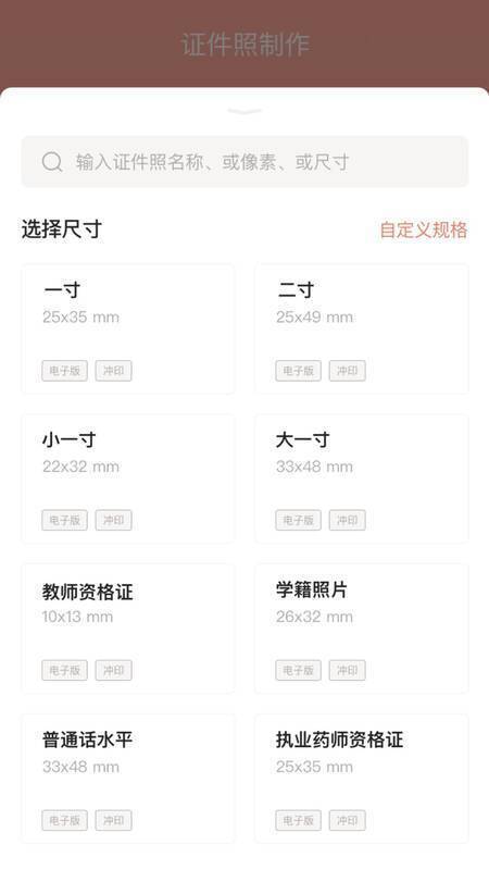 3. 内置多种常用证件模板,每种模板支持多种规格尺寸,可自由选择。