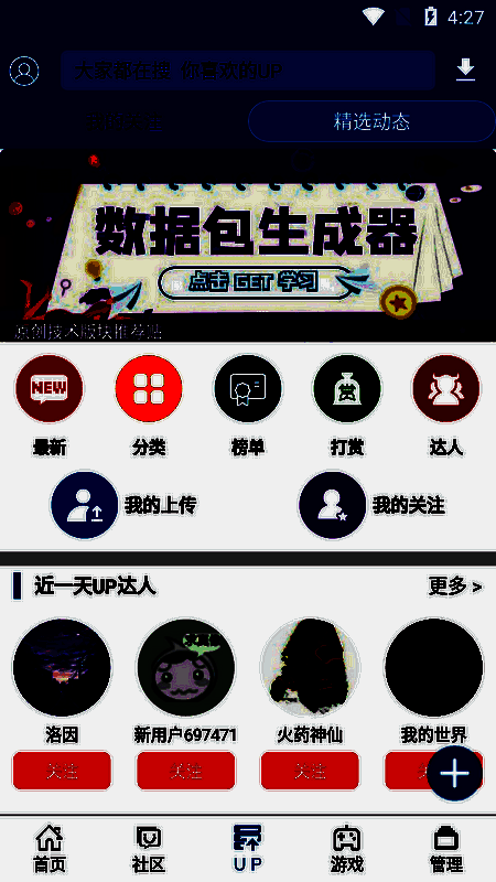 1、直接在 up 功能按钮里搜索不到 up 主,此时想找未关注的 up 主需点击“管理”。