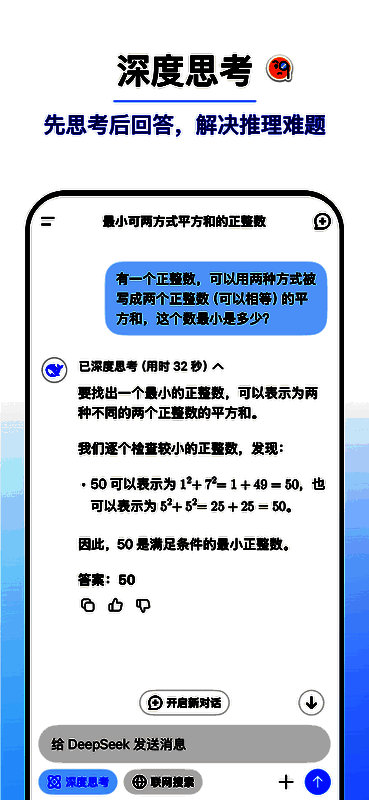 DeepSeek是一款人工智能AI软件,具备众多免费功能,像AI写作、AI思维、文章重写、智能对话等。用户使用这款软件,能解决诸多问题,充分感受人工智能技术的便利与实用。