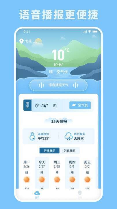该软件支持全国当地天气查看,能了解24小时天气,还可设置语音播报异常天气,为用户带来优质的查询服务。