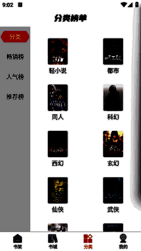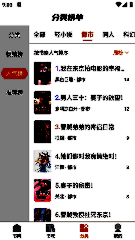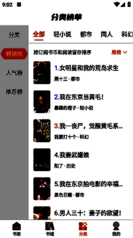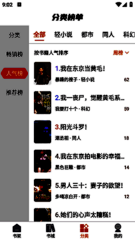 3、“分类”栏目对小说进行详细分类,如都市、同人、科幻等。