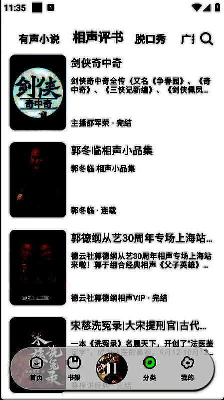 轻云听书能提供高清流畅的播放音效,内置各类音频资源,且全部免费,无广告干扰。详细的分类便于用户快速找到所需资源,用户还能收藏喜欢的资源,方便下次继续播放。