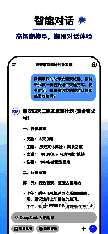DeepSeek官方下载安卓最新版本2025,是一款依托人工智能技术打造的智能助手软件。它致力于为用户提供精准、高效的信息获取及问题解决服务。不管是日常学习知识查询,还是工作中的数据分析与决策支持,DeepSeek凭借强大的自然语言处理能力和深度学习算法,都能实时给出准确答案与建议。该App以简洁界面、流畅操作、深入思考及在线搜索功能,收获大量用户青睐。
