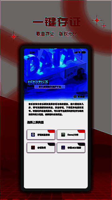 2. 你可以在 Demo/小样、存证成品音乐、存证歌词、存证 MIDI/曲谱中选择一项进行上传。