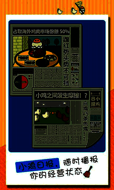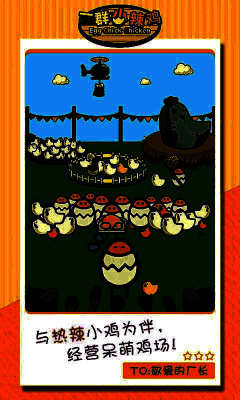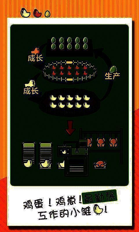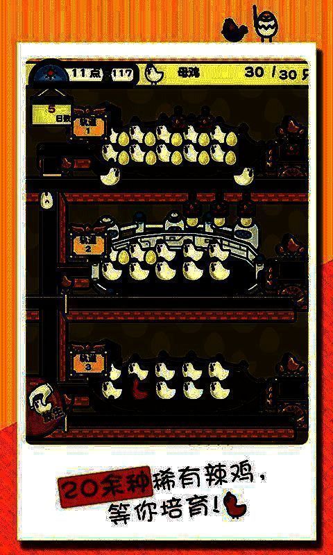 这是一款有趣的休闲游戏,堪称鸡中“斗士”。这里有最可爱且有意识的鸡工厂,从现在起,玩家就是养鸡场主人。能否培育出负责供应、生产和销售的超稀有鸡品种,就看玩家的本事了!在衰落之路上的神秘养鸡场,可爱勤奋的鸡等待着玩家。用收入改善鸡的居住环境,鸡进行体能训练提升品种增加收入。而且游戏节奏快,随时都能玩。