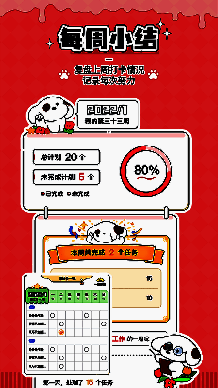 4、你能创建多个计划,而且在开启周计划部署时还能云端养宠,只需创建计划就能领养小狗。完成计划列表任务并打卡成功后,可领取狗粮。随着时间推移,狗狗的饱腹、清洁和健康会下降,要让狗狗健康成长,就得及时打卡并完成计划。