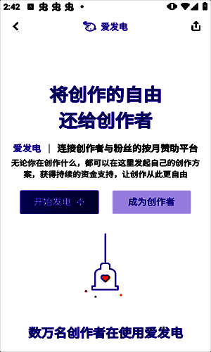 (1)爱发电是连接创作者与粉丝的会员制平台,支持各类创作者建立专属会员社区,获取持续资金支持,实现创作自由。
