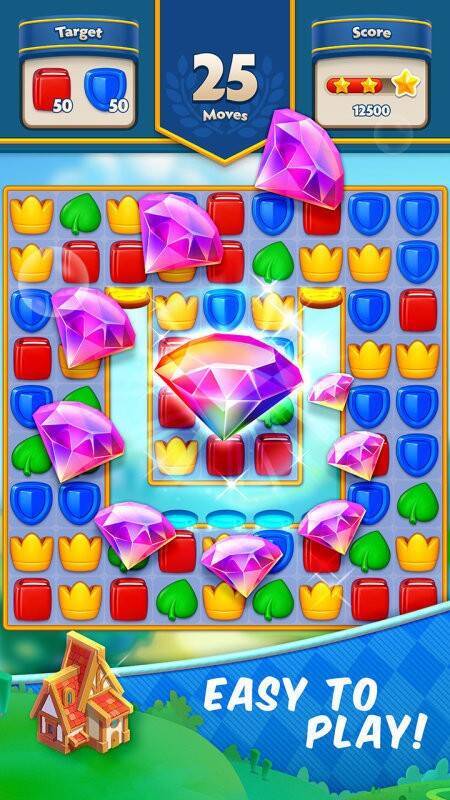 1、经典三消玩法:交换相邻水果,消除三个及以上相同水果,达成目标解锁下一关。