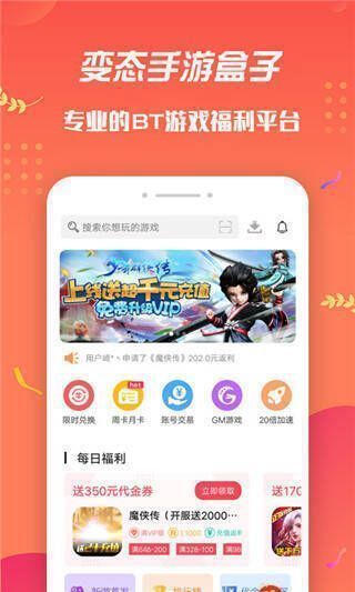 变态手游盒子免费版,是为广大手机游戏爱好者量身打造的游戏平台神器!该 app 体积小巧,不会过多占用手机内存,界面设计简洁清爽,操作十分便捷。它聚焦免费游戏资源,拥有丰富且分类精细的游戏库,流行的 BT 游戏、全 V 游戏、GM 游戏以及无敌中文版游戏等,都能轻松在此找到,充分满足玩家多样化的游戏需求。还支持一键下载安装,让玩家随时开启游戏之旅!