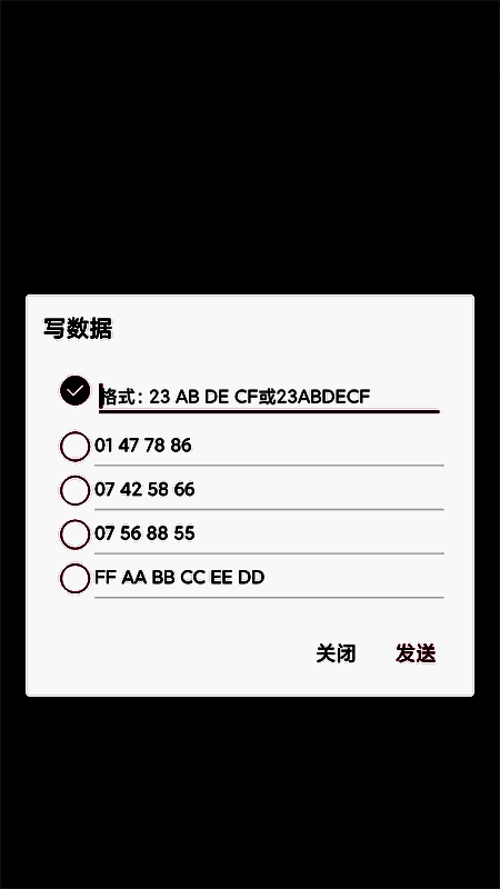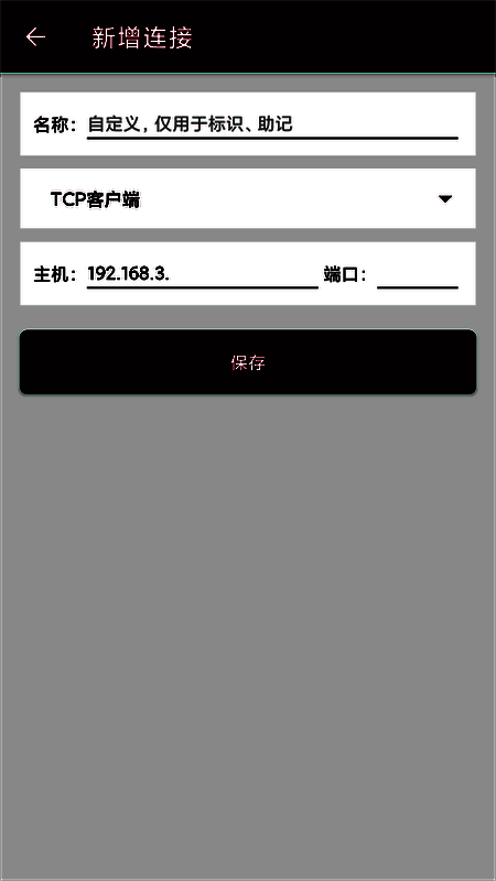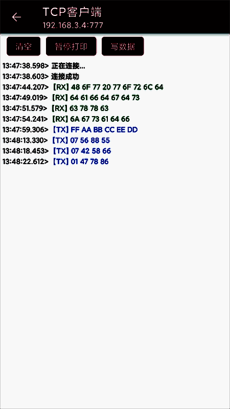 - TCP 服务端工作模式:头部有工作模式选项(TCP 服务器、TCP 客户端)和数据格式选项(字符、hex 数据格式),IP 输入框和端口输入框用于输入目的地的 IP,右侧按钮用于连接/断开(服务器模式下为打开/关闭)以操作是否建立连接。中部显示交互过的数据,下方是要发送的数据,单击发送。