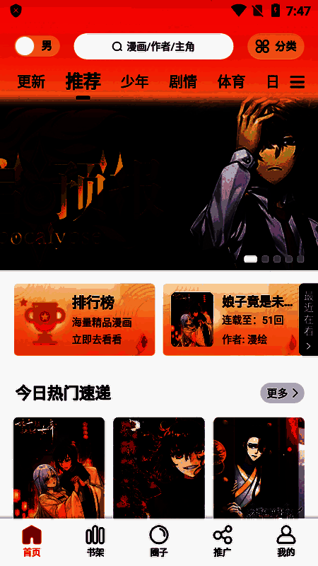 汇聚众多漫画佳作,打造全互联网受欢迎的漫画平台。不仅有漫画资源,还有丰富小说资源,提供大量免费作品。能实时更新漫画,流行漫画多,更新速度基本即时同步,满足各年龄段需求。