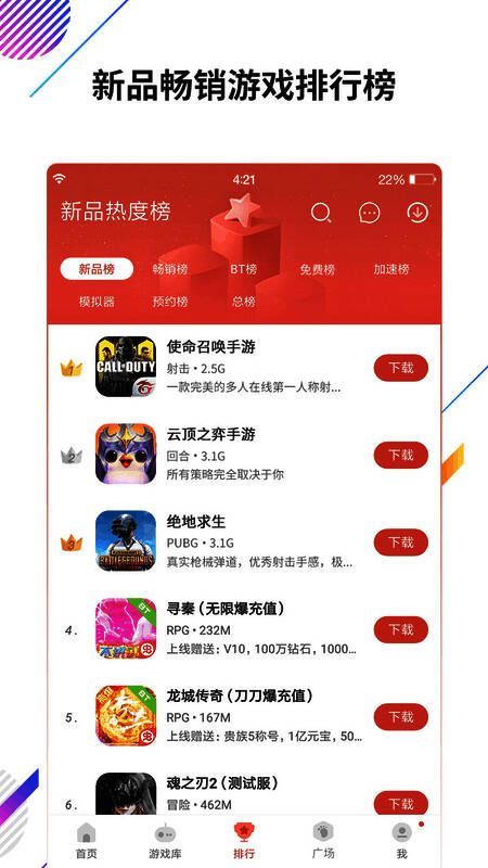 2、具备权威游戏排行,能一手掌握新品好游,还有BT/畅销/MOD/预约榜单倾情推荐。