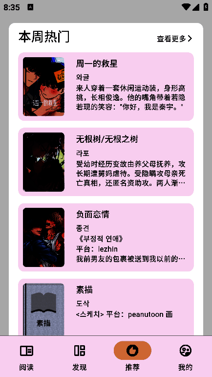 猫番阅读漫画免费读最新版是集小说、漫画、动漫于一体的资源工具。它汇聚互联网最新最热的小说和漫画资源,包含韩国、日本和中国漫画,一应俱全。能满足不同用户对各类小说、漫画和动漫的需求。软件资源更新快、内容丰富,界面简洁无杂乱促销,带来纯粹用户体验!