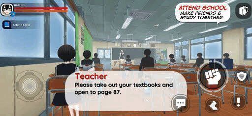 5、到达学校,屏幕右下角有拳击、疾走、防御等动作指令可供使用。