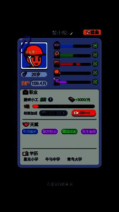 6. 多维增长系统别具一格。用“抵押压力”“人性温暖”等真实指标替代传统数值。公务员笔试通过后,体检“脂肪肝”可能提示你转向直播销售。技能树包含“吹牛赚钱”“避开酒桌”等实用又荒诞的能力,健身房还能教你“吸收头发”。