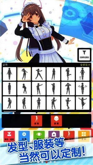 1、高度可定制角色:玩家能够自由调整角色的发型、五官、身体比例和服装,塑造独特的虚拟偶像。