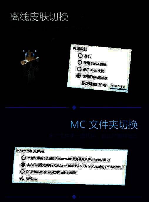 1. 支持离线换皮,玩家可随意在史蒂夫、亚历克斯等皮肤间切换。