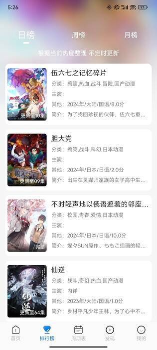 可根据动画情节自由切换播放。剧风资源丰富,更新速度快,还支持缓存。动漫节目列表种类繁多,满足各种观看需求。所有资源实时更新,与各大平台同步更新热门资源。