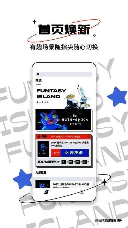 纷玩岛演唱会门票官网版是一款专为粉丝打造的演唱会购票软件。平台内容多元,涵盖采访资讯、迷你综艺、深度话题等,能为用户带来绝佳的娱乐与潮流生活体验。它可让用户率先获取最新流行娱乐资讯,近距离感受偶像魅力,还能一同分享直播的喜悦。