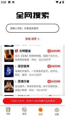 鸠摩搜书app安卓版官网APP具备强大的搜书能力,不管是电子书小说,还是办公文档、经典名著、学习资料等,都能快速搜索并下载。软件收录海量书籍,免费供用户使用,界面美观,还支持用户与作者在线互动。