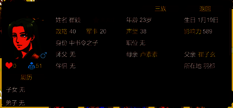 14、这里可以看到崔子玄的次子崔颖还未成婚,将崔颖纳入后宫和崔子玄结为姻亲关系,显然是一个成本很低的缔结同盟的方式。请点击崔颖的名字进入他的个人资料。