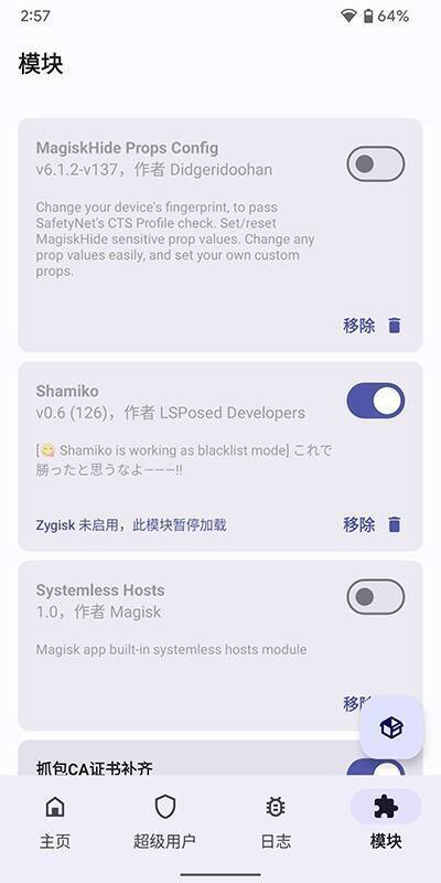 方法2:用MT管理器删除data/adb文件夹,随后立即使用当前magisk的模块功能,本地安装刷入delta.zip卡刷包,重启手机后安装对应APP即可。