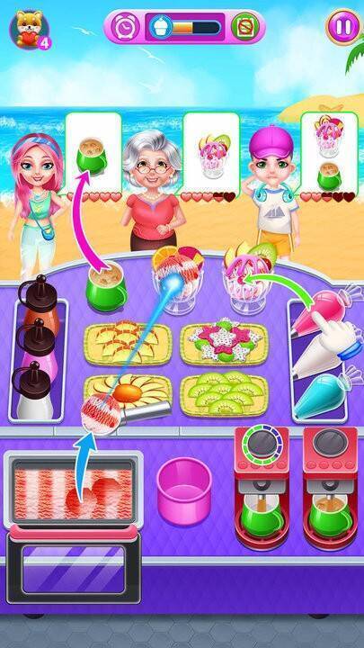 1、玩家从丰富食材中挑选水果、冰淇淋和配料,自由搭配制作专属圣代。