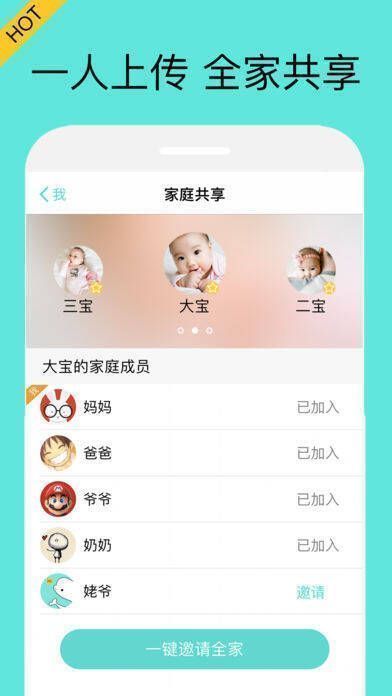 【家庭共享】:可一键邀请全家,一人记录,全家共享,方便长辈查看宝宝照片和视频。