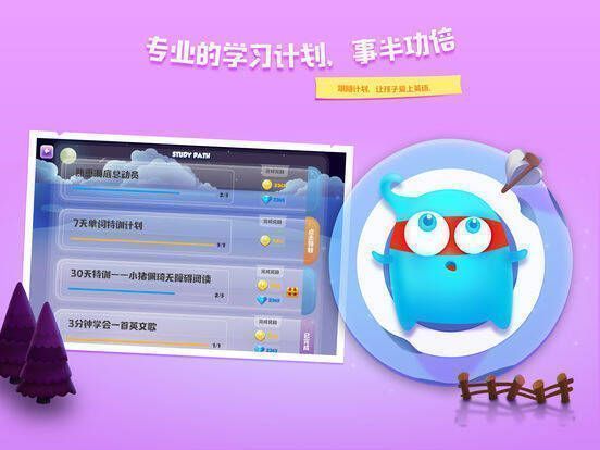 2. 既有优质成体系的英语学习内容,又为不同年龄段孩子定制清晰学习计划,完成任务可享受语言进步的快乐。