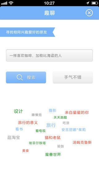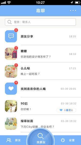 生活不能无趣,交友不能无聊。想找和自己兴趣爱好相同的男神女神,趣聊是最便捷的地方。在趣聊,你能找到兴趣相投的人,尽情释放自己的兴趣;能和对方畅聊兴趣,这里是相知相识的舞台;可以给好友发语音、文字消息、表情,还能发送alt为“聊天图片”的图片;拥有自己的朋友圈子,随时与好友分享生活精彩瞬间。