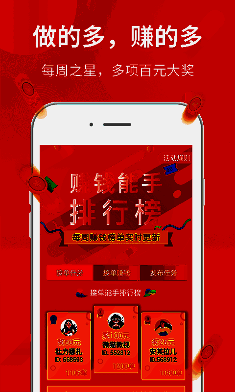 每月设有明星月奖励,订单数量达标或金额达标都有100元奖励,多种奖励可叠加。邀请朋友能获现金红包并共享收入,轻松开启2019年新的赚钱模式。软件支持学生兼职、宝妈兼职、在家兼职、周末兼职、淘宝兼职等多种任务类型。