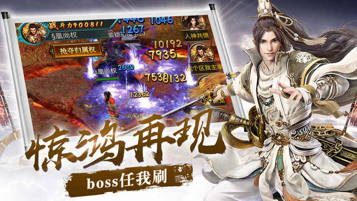2、多样玩法:包含自动挂机升级、全民抢 boss、大型公会战、特色 Avatar、多人同屏抢装备等。