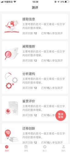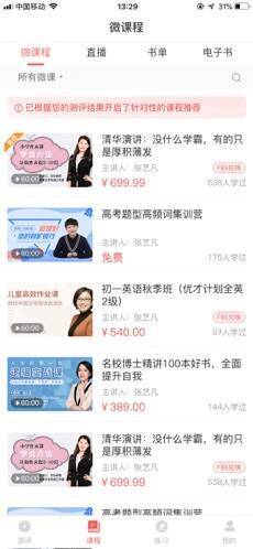 测评功能,可对阅读情况进行测评;微课堂,随时查看学习信息;直播课,能与老师直播互动;电子书,优质书籍在线离线皆可看;练习模块,随时进行练习强化;我的模块,方便管理书籍和课程。